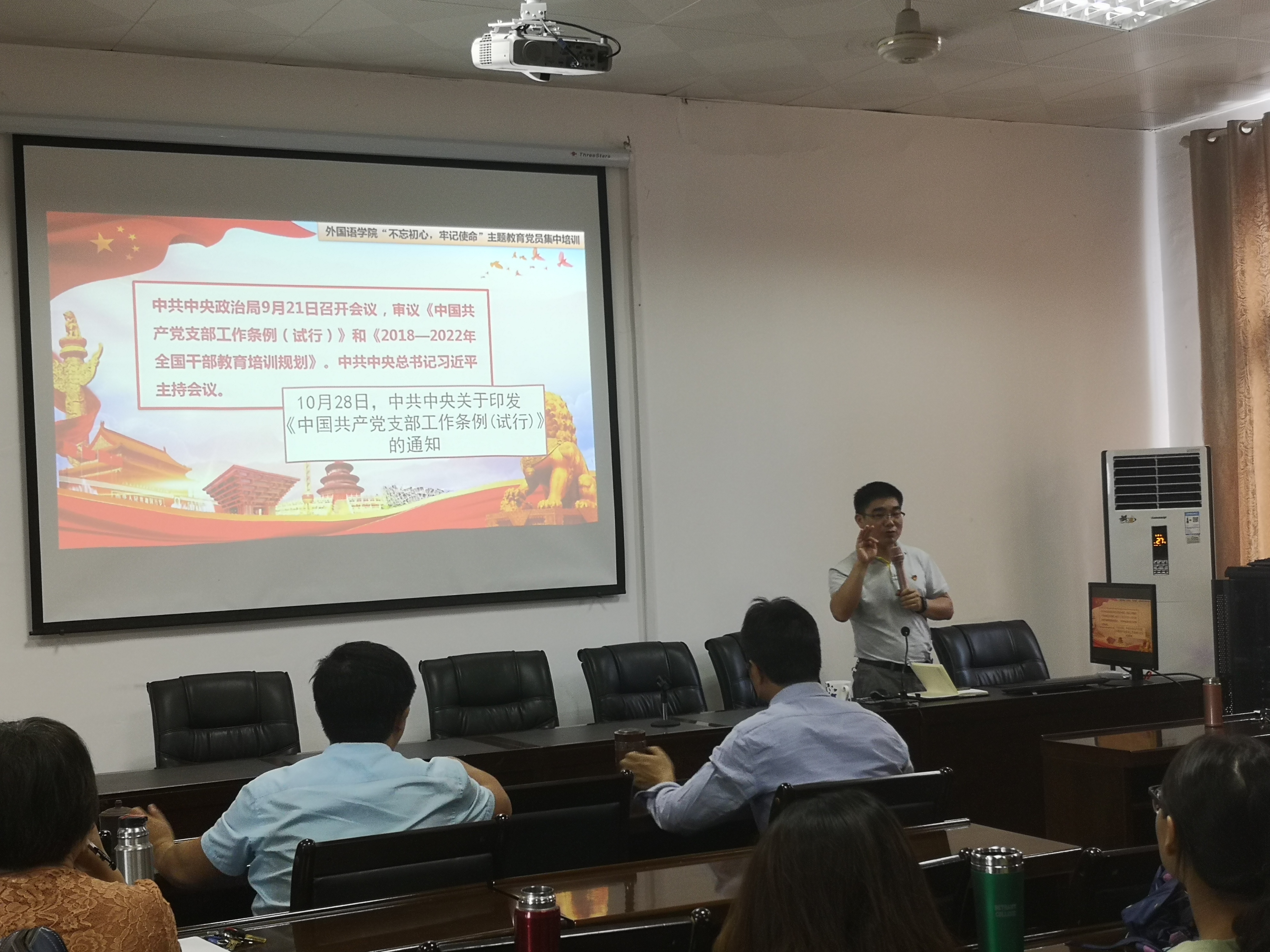 9月29日下午,根据学院主题教育活动安排,威廉希尔体育教工支部在三楼会议室集体学习《支部工作条例》,加强支部建设,党课由党委书记胡永华授课。