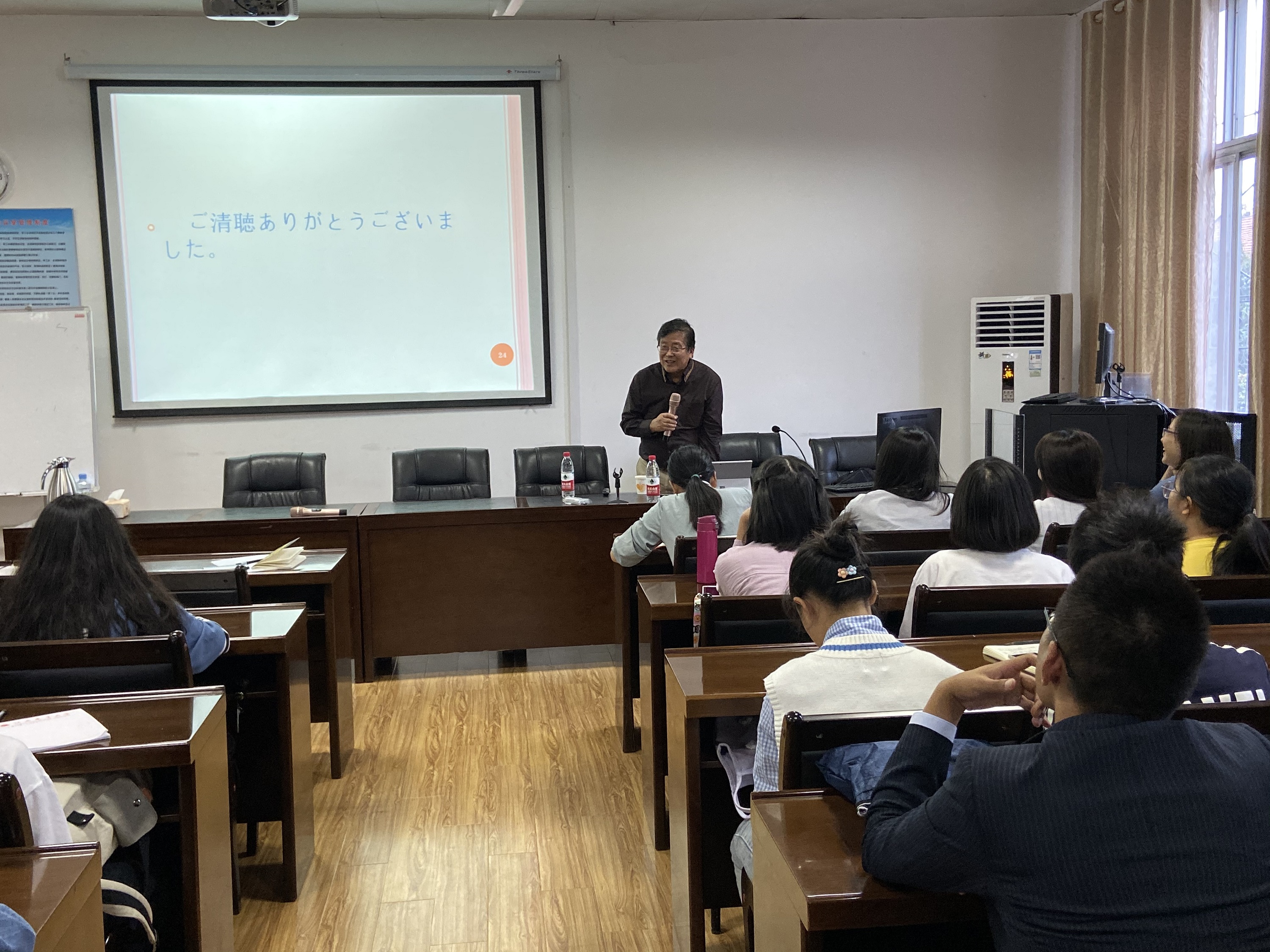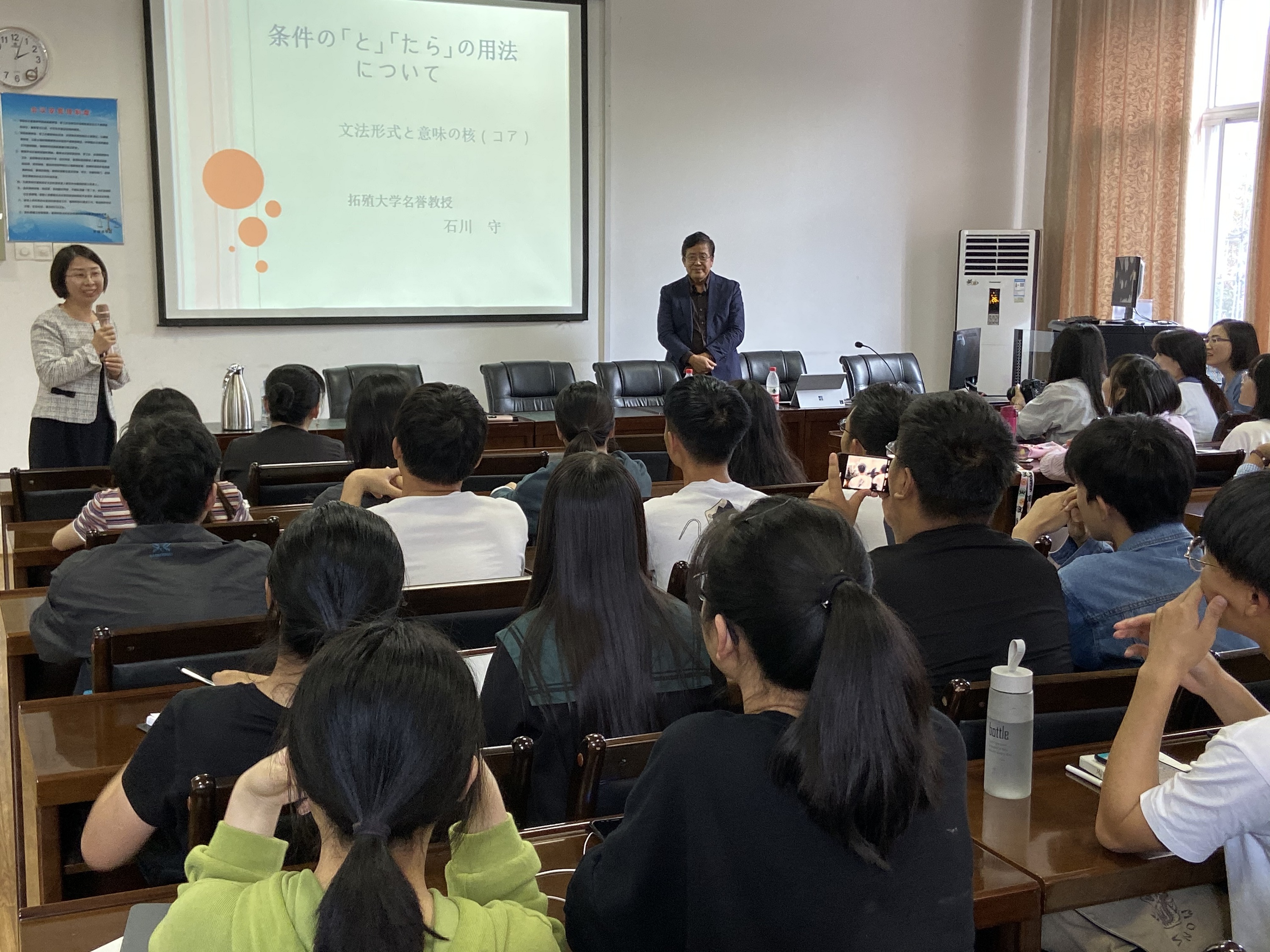 石川教授一直从事日语教育事业,在语言教授法、日本语教育方面的研究硕果累累,今年已七十高龄从日本拓殖大学退休并获荣誉教授称号。报告中石川教授着重讲解了日语语法中表示假定条件的“と”和“たら”的用法及区别。与会人员通过石川教授深入浅出的介绍充分了解了两者的区别,对日语语感的解读也得到了提升。