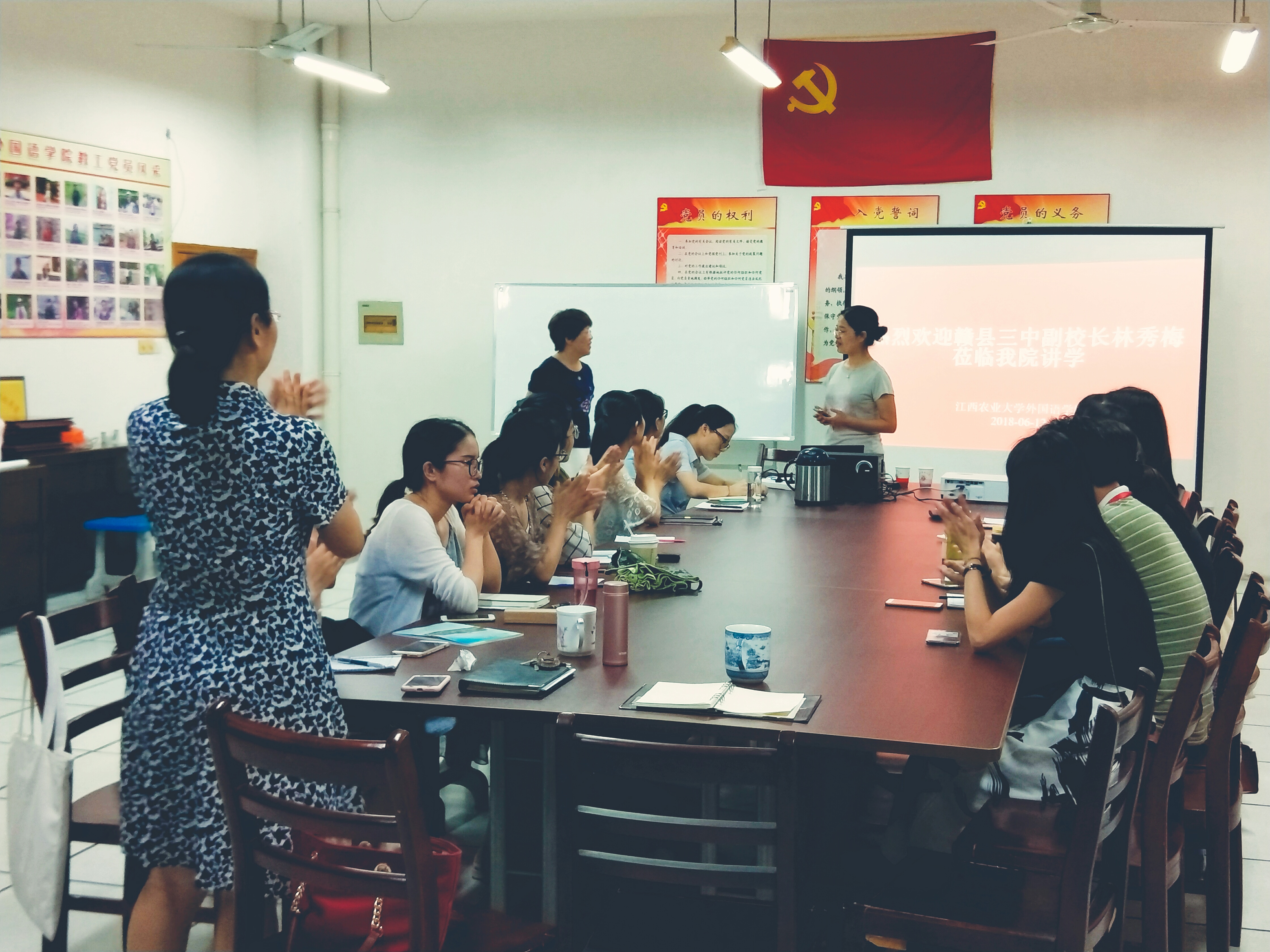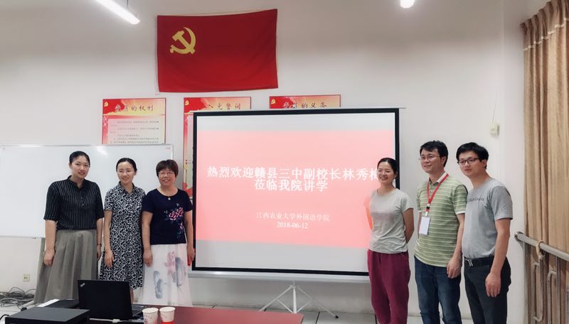 在学校高考阅卷之际,来自江西省内的各中学的老师们齐聚江西农业大学。借此机会,6月12日晚在威廉希尔体育肖友群书记、吴伟萍院长的邀请和精心安排下,学科教学(英语)的导师和全体学生有幸聆听了来自赣州赣县三中副校长林秀梅的讲学和英语教研组长白璐的授课。